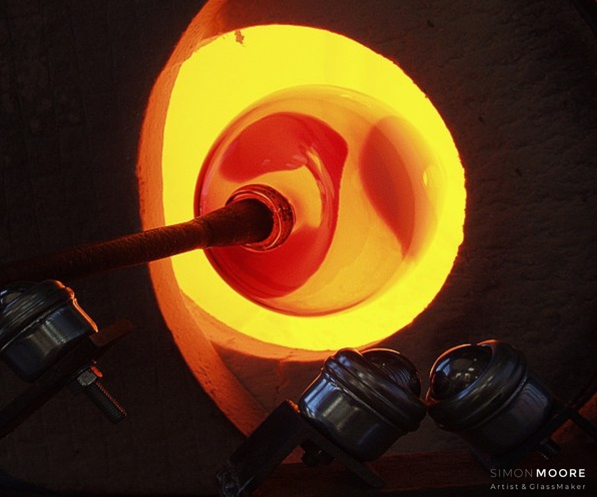 The notion that glass is a fluid material is a fundamental attribute of the medium to Simon. In the workshop discussion centres around a line, a mark, or shape, which all must have 'material tension'. Simon’s mantra is "there's nothing worse than an overworked piece of glass". Shapes must be made with this in mind, allowing a fresh and uncomplicated character and soul. Whilst decoration is used, the marks must be uncomplicated and are acceptable only if they are fluid and allied to the form.